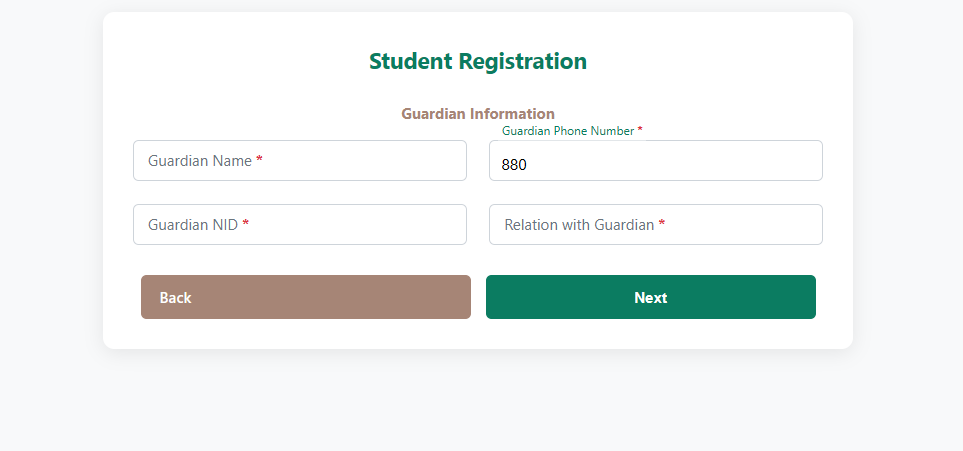 অভিভাবকের নাম, অভিভাবকের সাথে সম্পর্ক, অভিভাবকের মোবাইল নম্বর ও অভিভাবকের NID নাম্বার (10 বা 17 ডিজিট এর)।