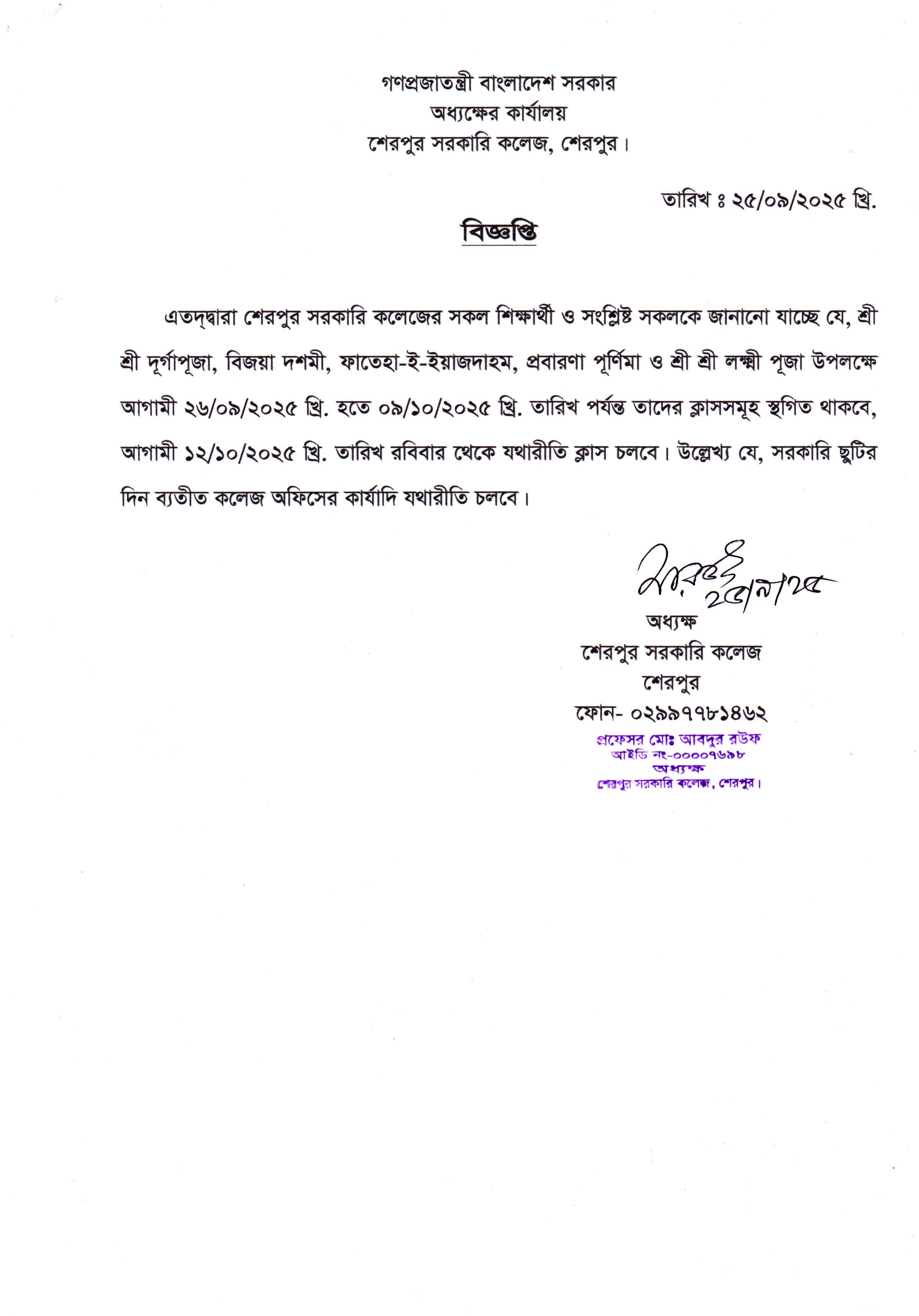 ২৬/০৯/২০২৫ খ্রি. হতে ০৯/১০/২০২৫ খ্রি. পর্যন্ত কলেজের ক্লাস বন্ধ সংক্রান্ত বিজ্ঞপ্তি