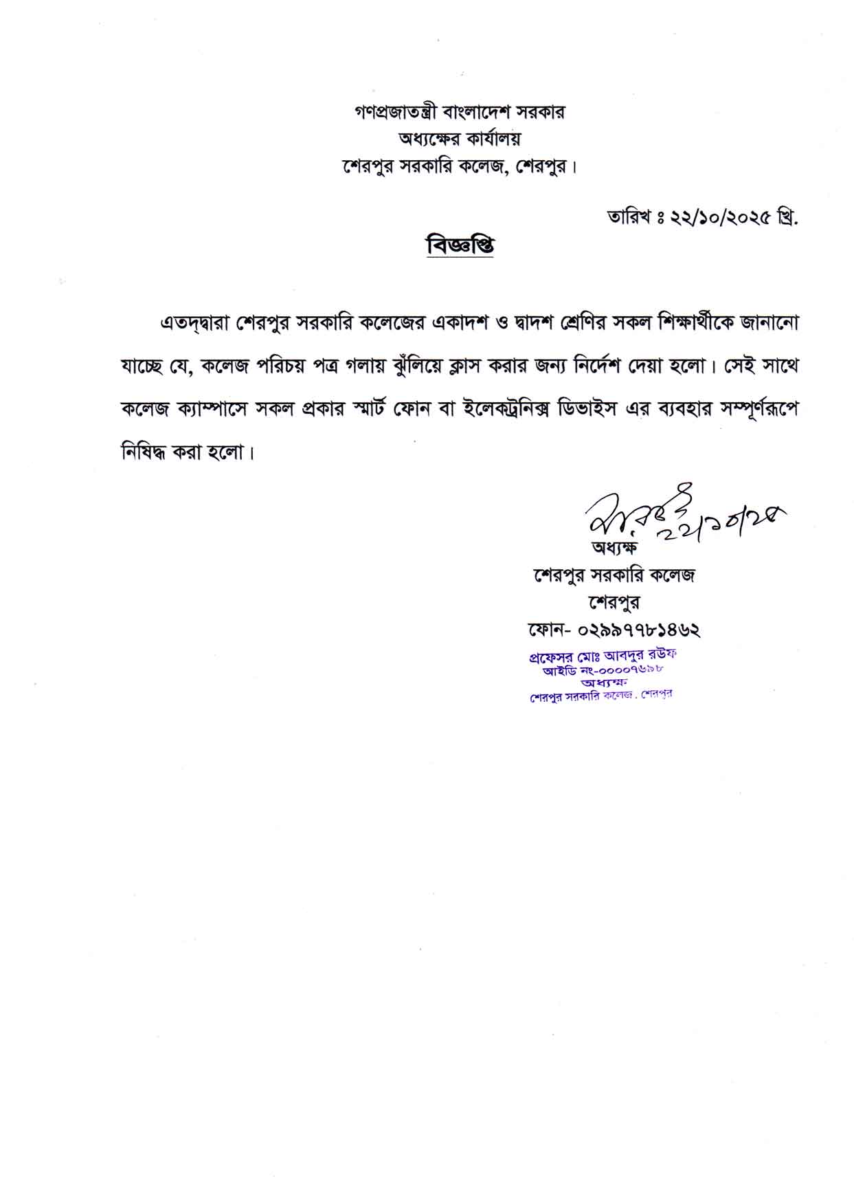 একাদশ ও দ্বাদশ শ্রেণির শিক্ষার্থীদের স্মার্ট ফোন নিষিদ্ধ সংক্রান্ত বিজ্ঞপ্তি