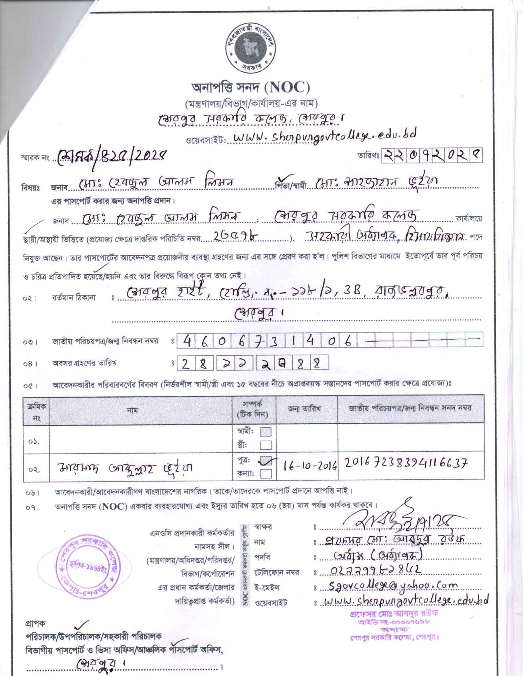 জনাব মোাঃ হেবজুল আলম লিমন, সহকারী অধ্যাপক, হিসাববিজ্ঞান এর NOC (অনাপত্তিপত্র)